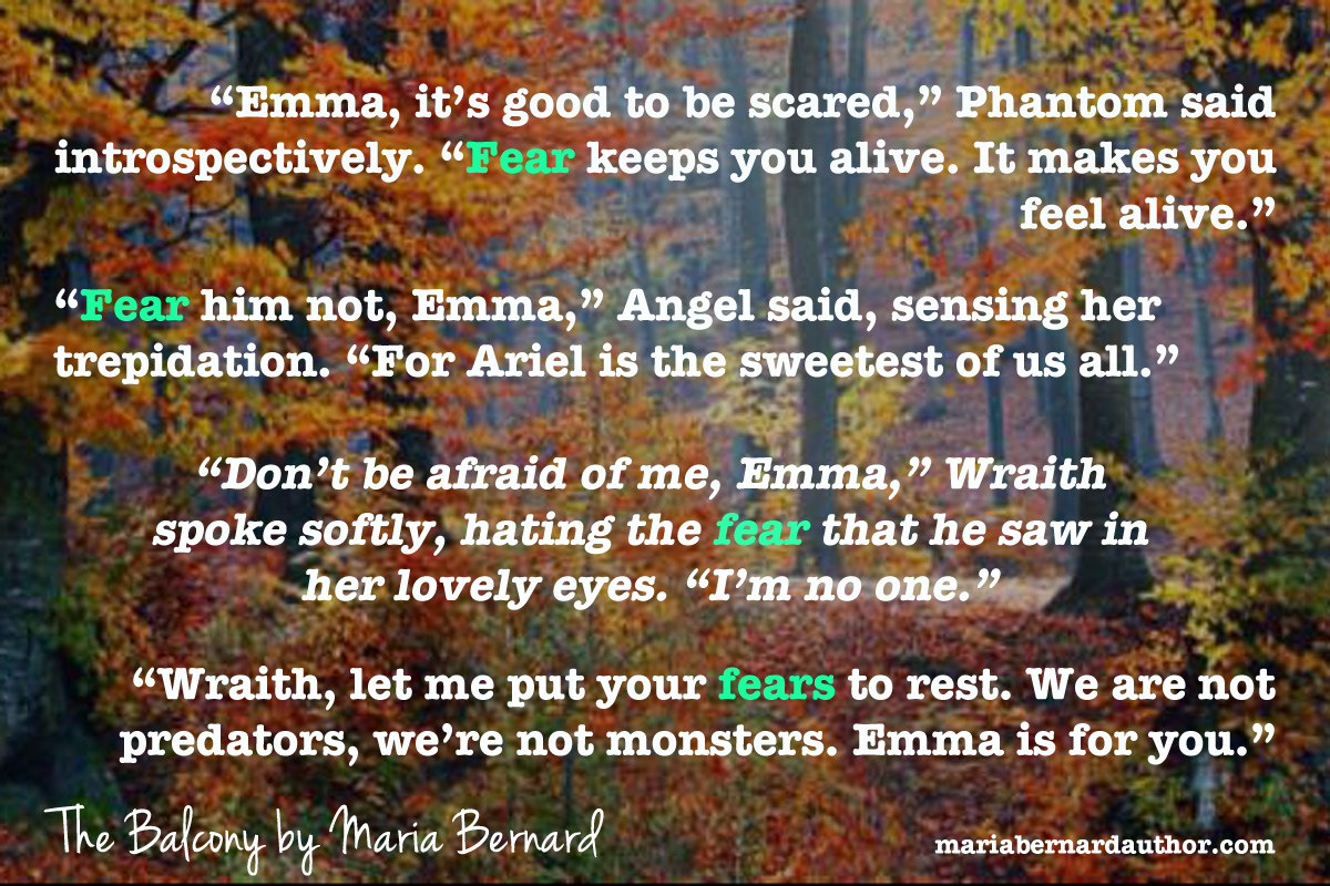 Not long ago, I created some teasers from my books around the word fear and as a result, I realized how often it actually comes up in my writing. Should it worry me? Stress me out? No, I find it fascinating.